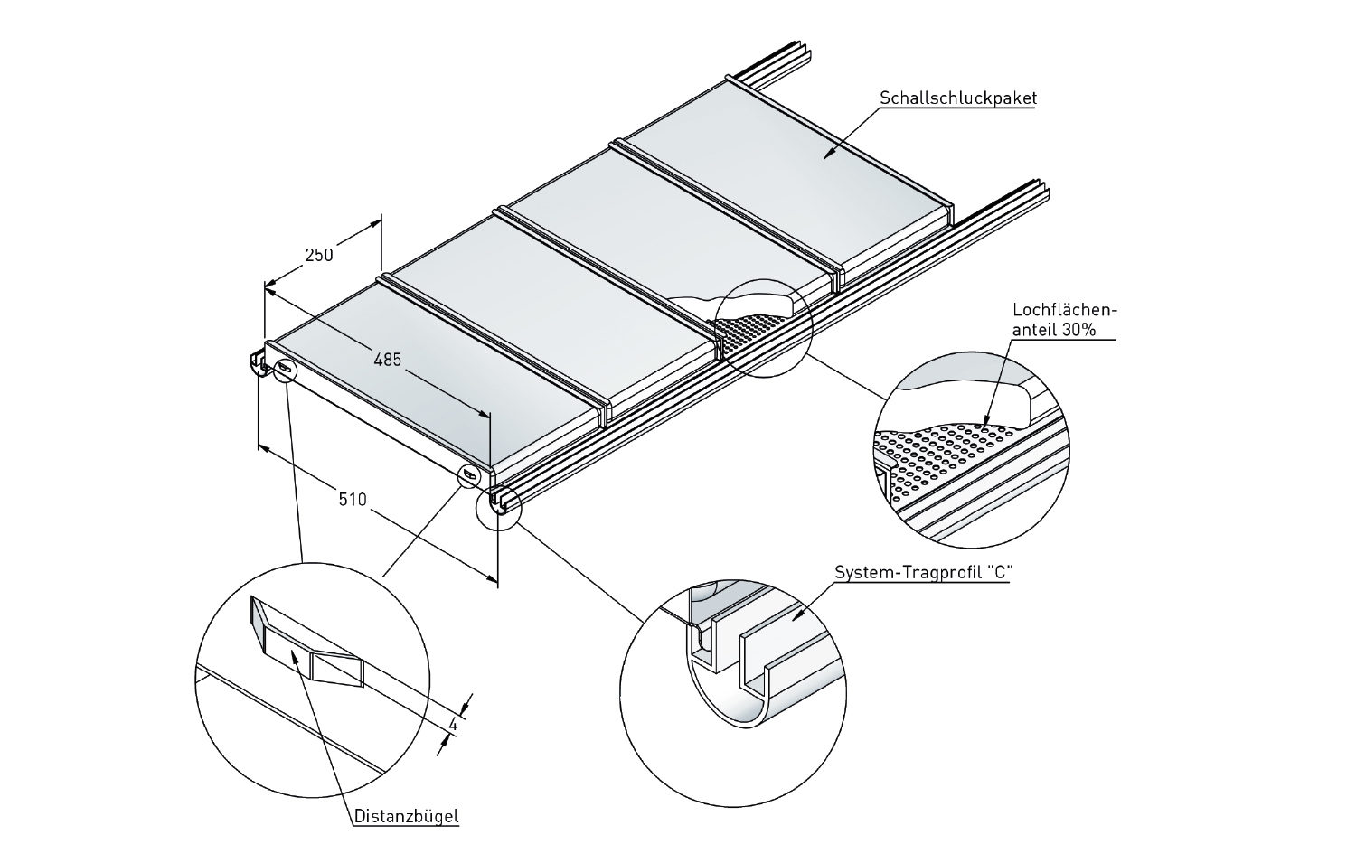 Dieses System stellt zusammen mit den anderen Bauteilen einen einheitlichen Deckenverbund dar. Zur Reinigung der Bauteile lassen sich diese ohne Werkzeug aus dem Deckenverbund entnehmen. Dabei können sie zur einfacheren Handhabung und Entnahme über darunter stehende Geräte hinweg geschoben werden, was eine schnelle, wirtschaftliche und gefahrlose Reinigung ermöglicht. Der eingeschobene sowie herausziehbare Schallabsorber (Baustoffklasse A) ist hygienisch einwandfrei in eine Kunststofffolie eingeschweißt. Dieses Schallschluckpaket lässt sich mit einem Handgriff zur separaten Reinigung entnehmen. Die Anforderungen der VDI 6022 werden somit erfüllt.